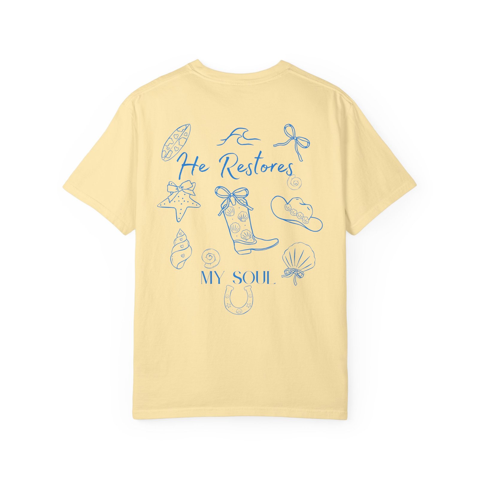He Restores My Soul T-Shirt for Women – Christian Coastal Cowgirl Tee – Psalm 23:3 Bible Verse Shirt