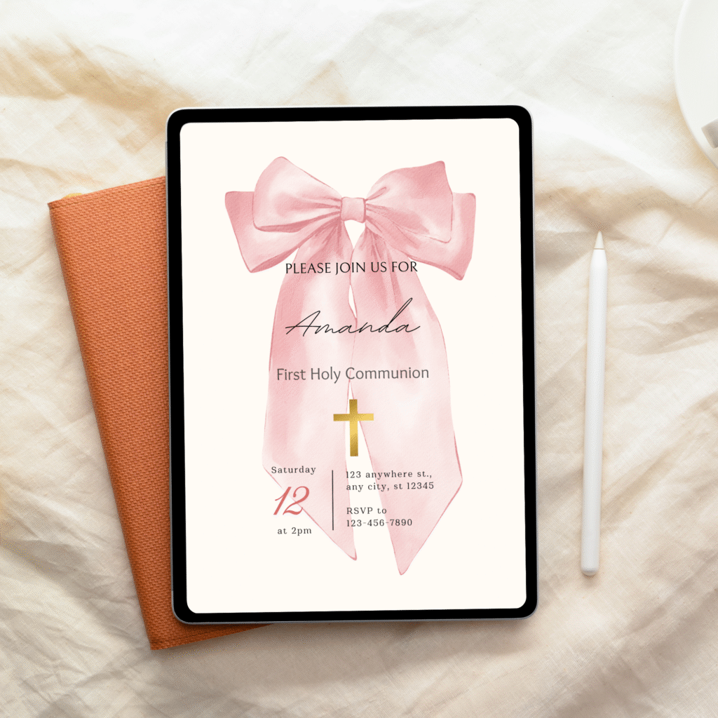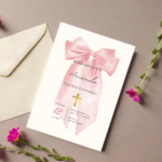 This elegant pink bow invitation was thoughtfully designed to reflect purity, grace, and the beauty of this special day. With soft feminine tones and a timeless layout, it creates a meaningful first impression for a moment your family will always treasure.